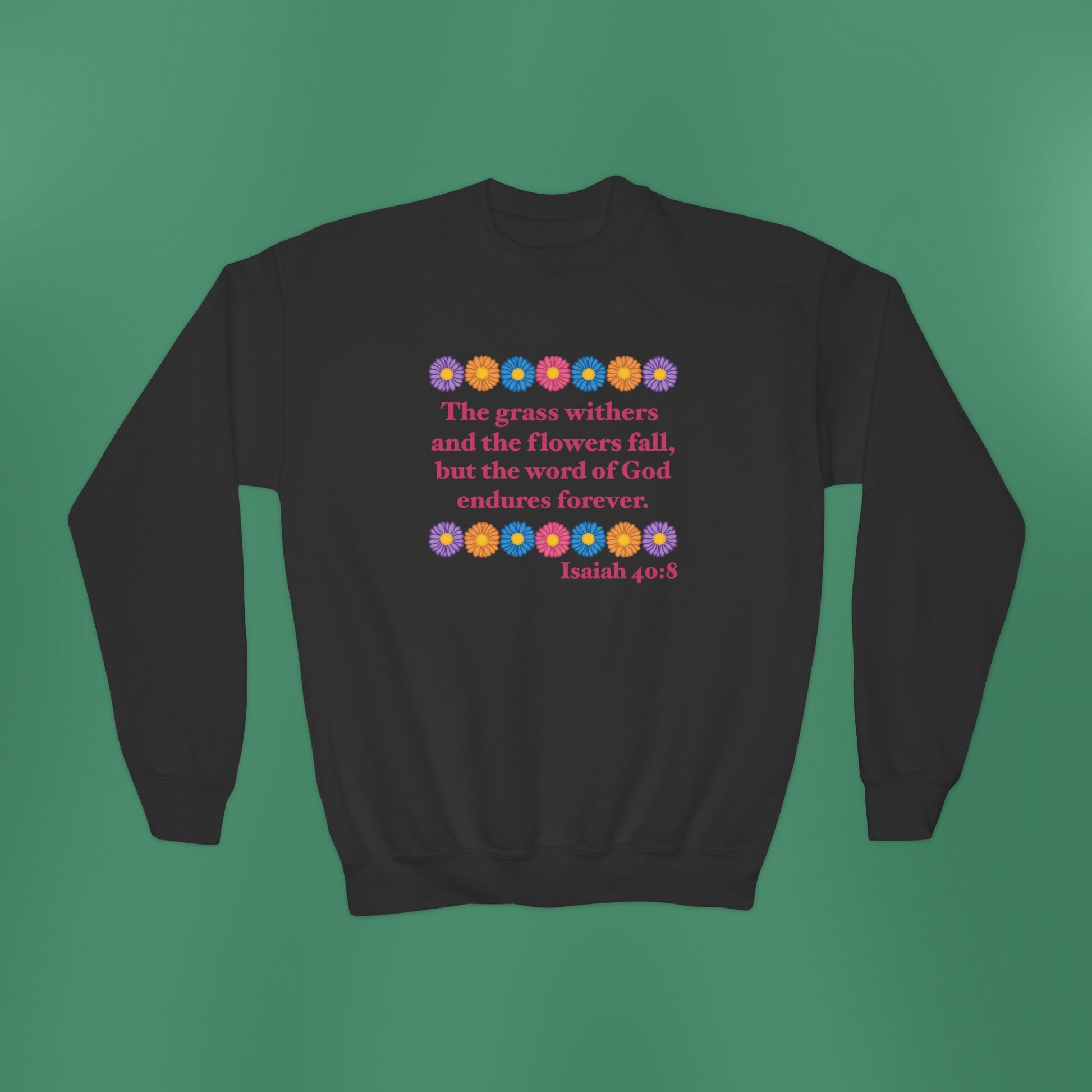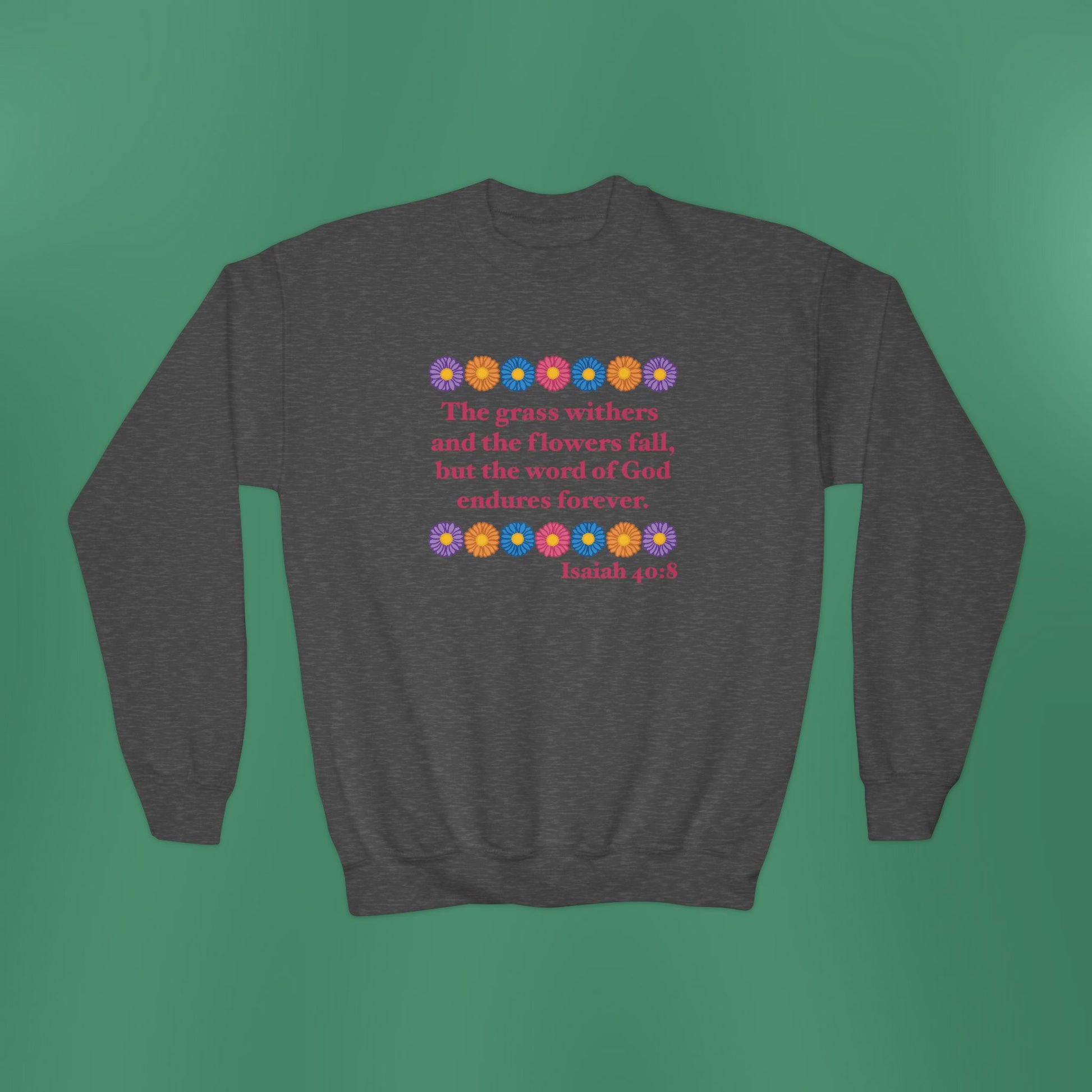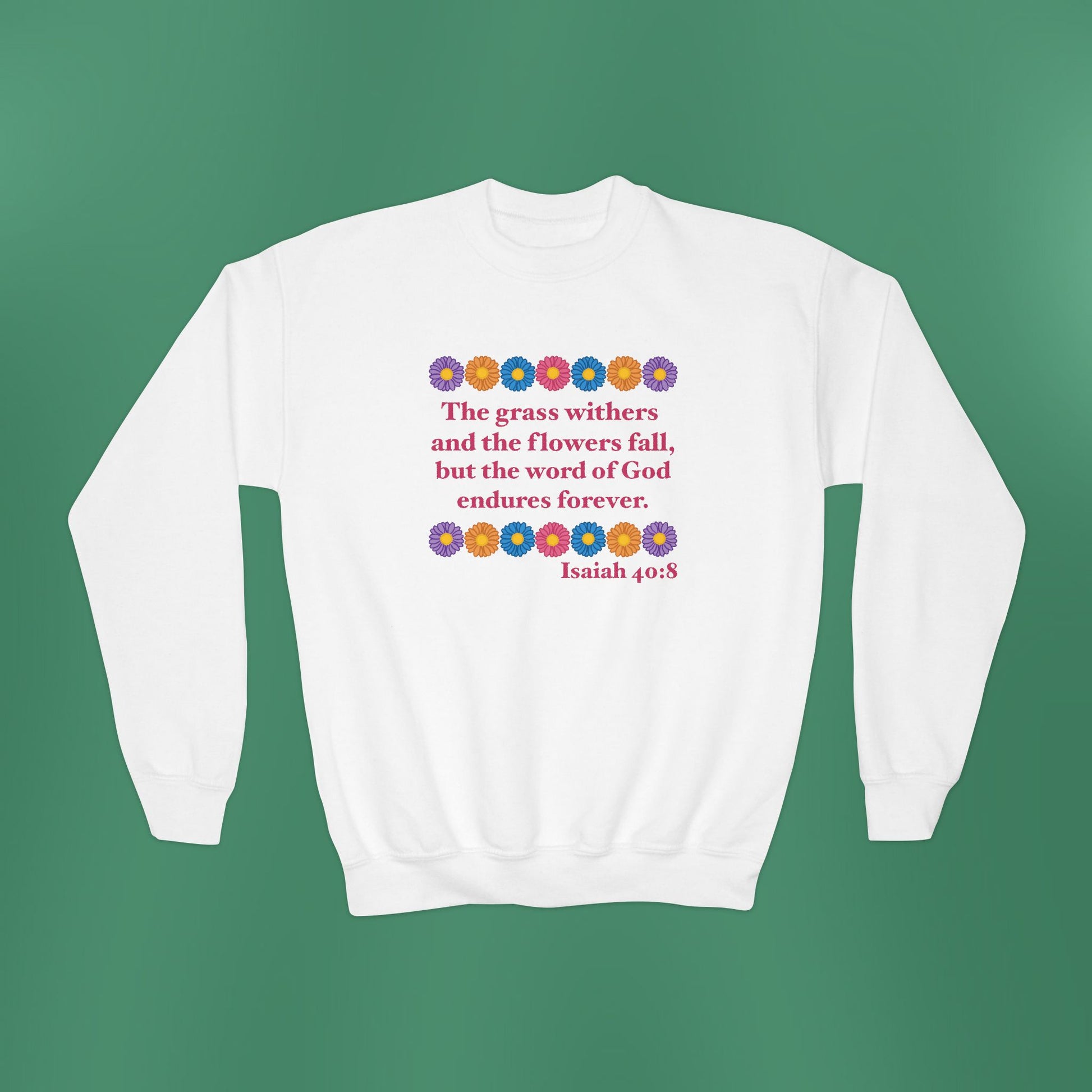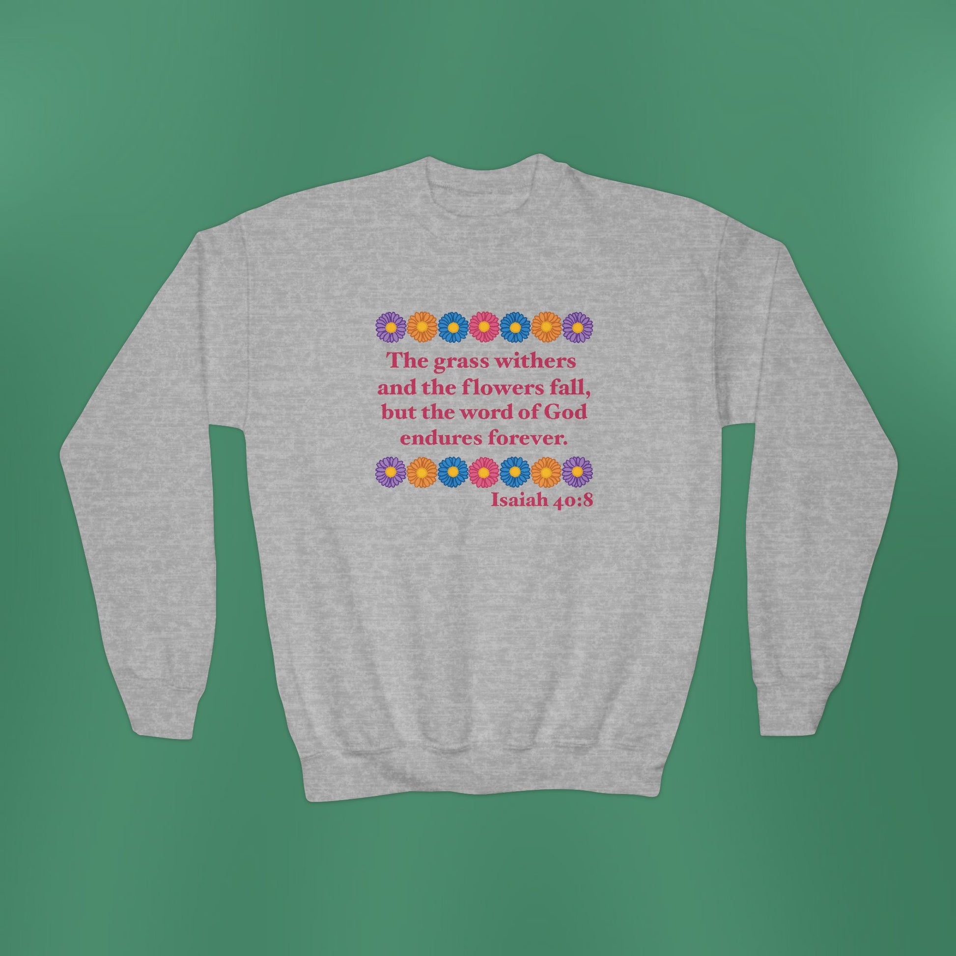 A simplistic, yet stunning design based on Isaiah 40:8! Made with a comfortably balanced blend of 50% cotton and 50% polyester, the sweatshirt is the perfect choice. Its medium-heavy fabric delivers a cozy, warm feeling while each sweatshirt runs true-to-size for a great fit.