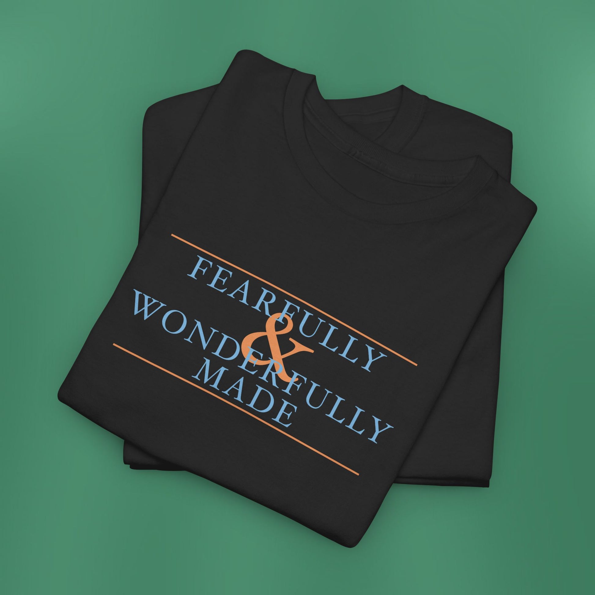 A simplistic, yet stunning design based on Psalm 139:14! The heavy cotton tee is the basic staple of any wardrobe. The shirt has a classic, comfy fit with medium fabric.