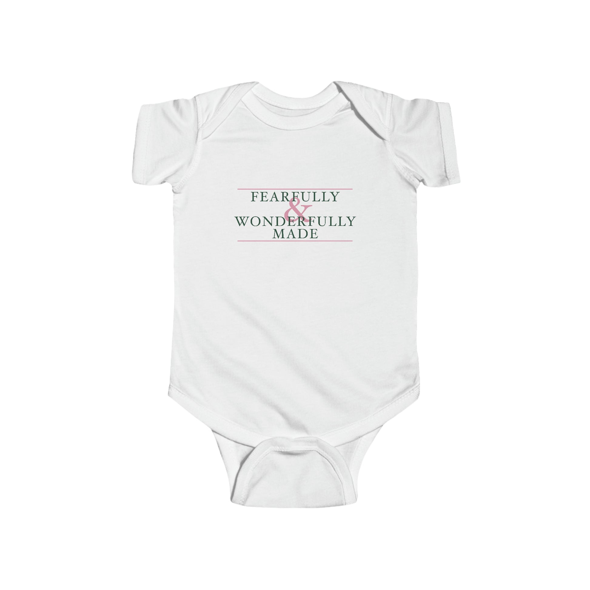 A simplistic, yet stunning design based on Psalm 139:14! This baby clothing is both durable and soft. The fabric is 100% cotton for solid colors. For heather colors, polyester is included. There are seams along the sides of this product. All bindings are made with ribbed knitting for improved durability. There are plastic snaps at the cross closure for easy changing access.