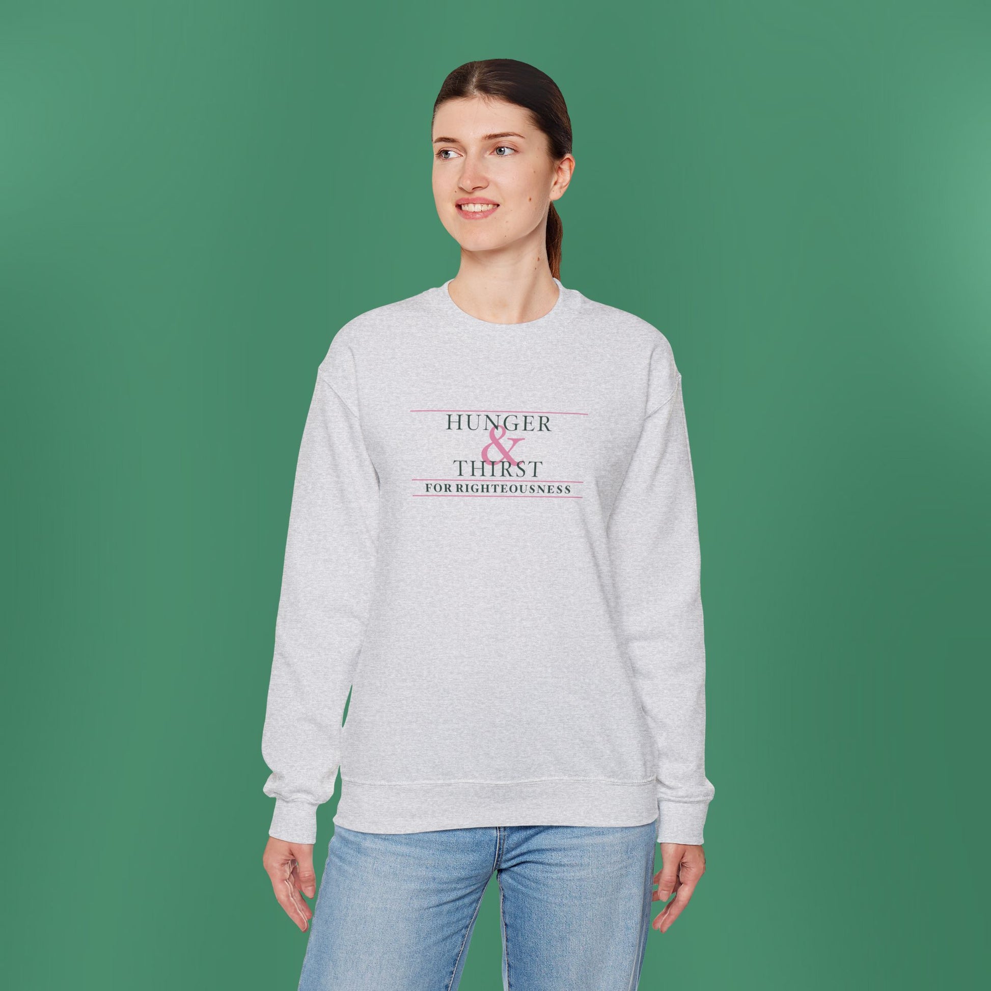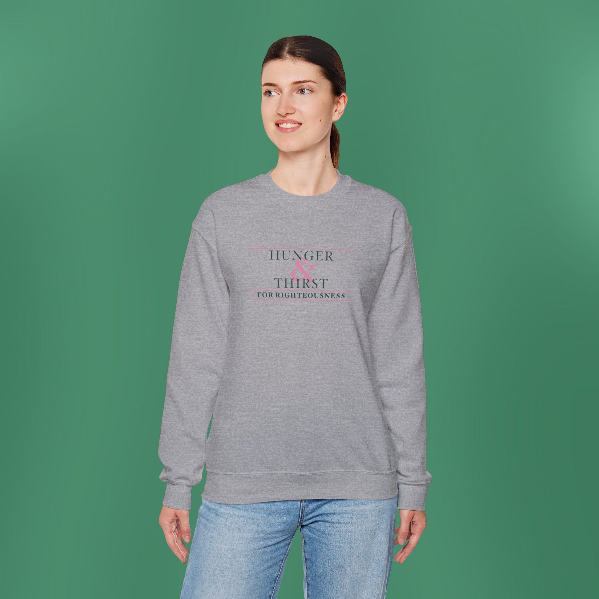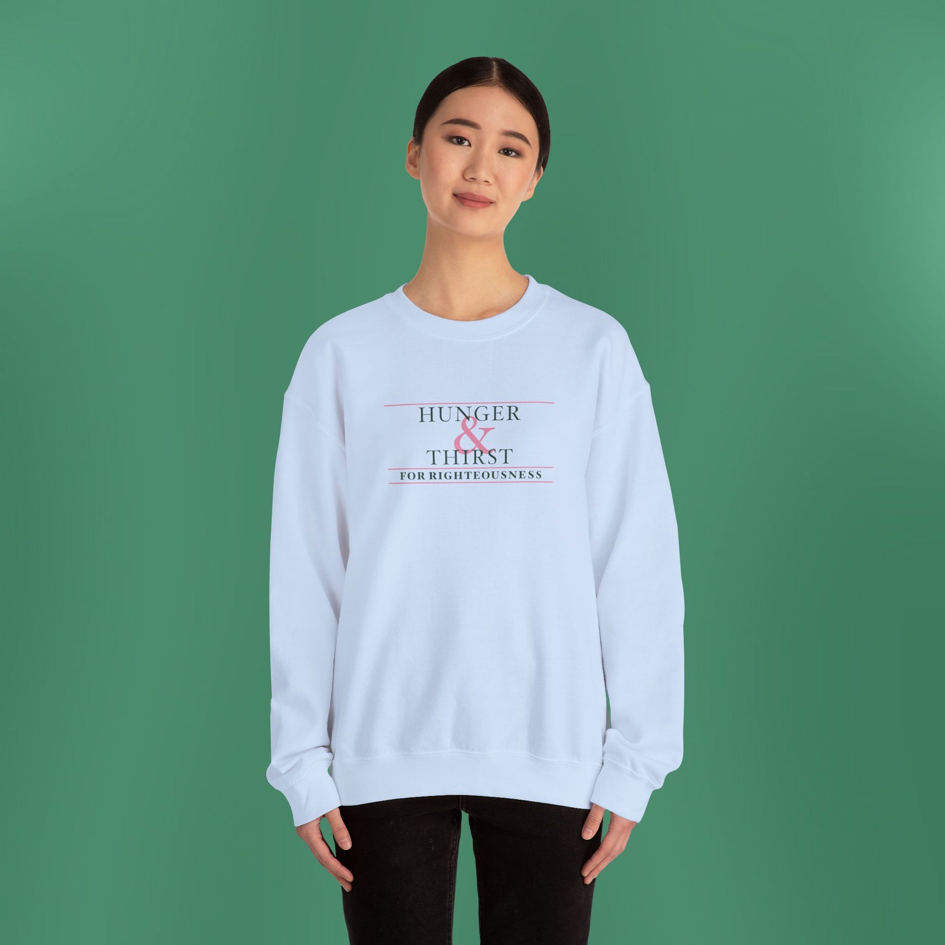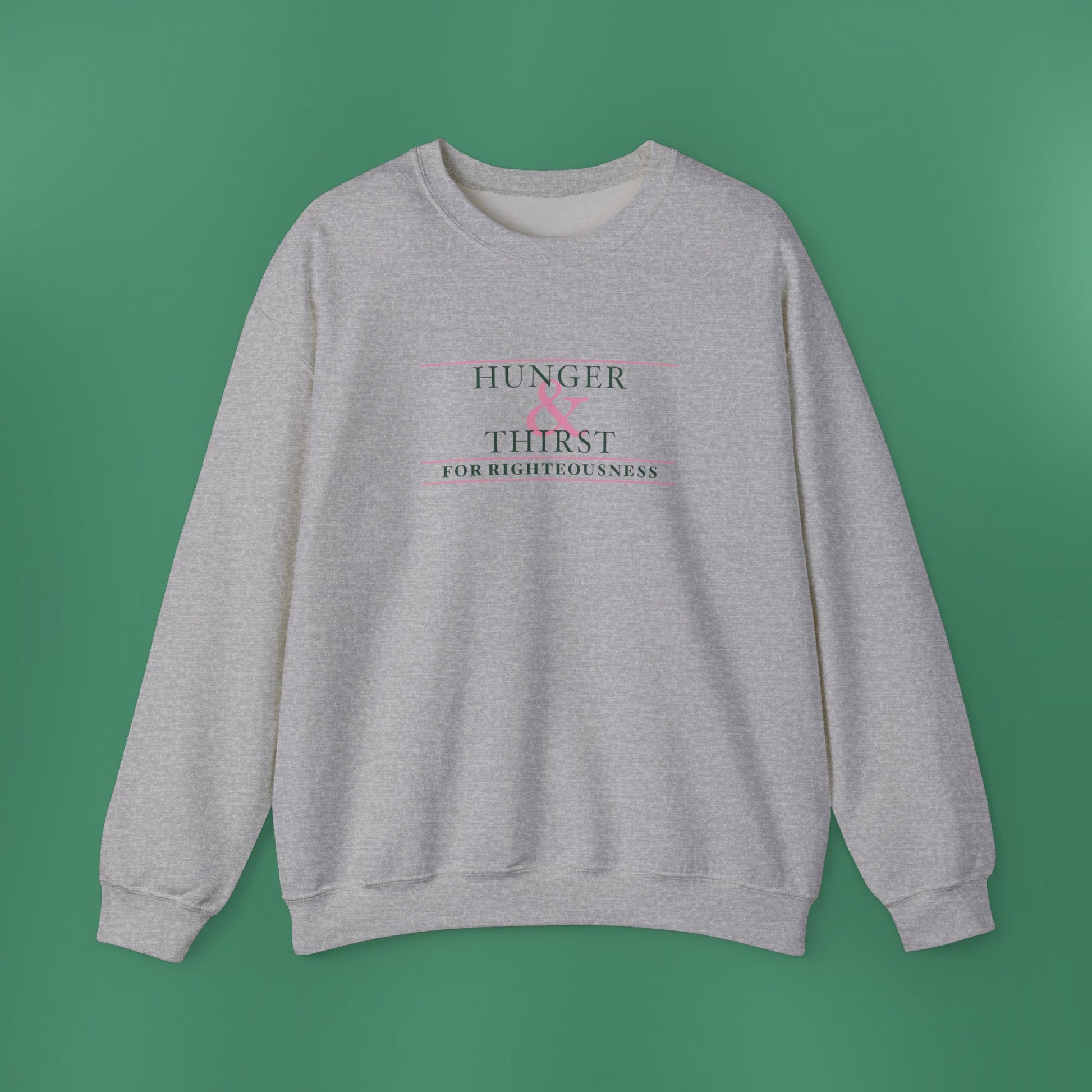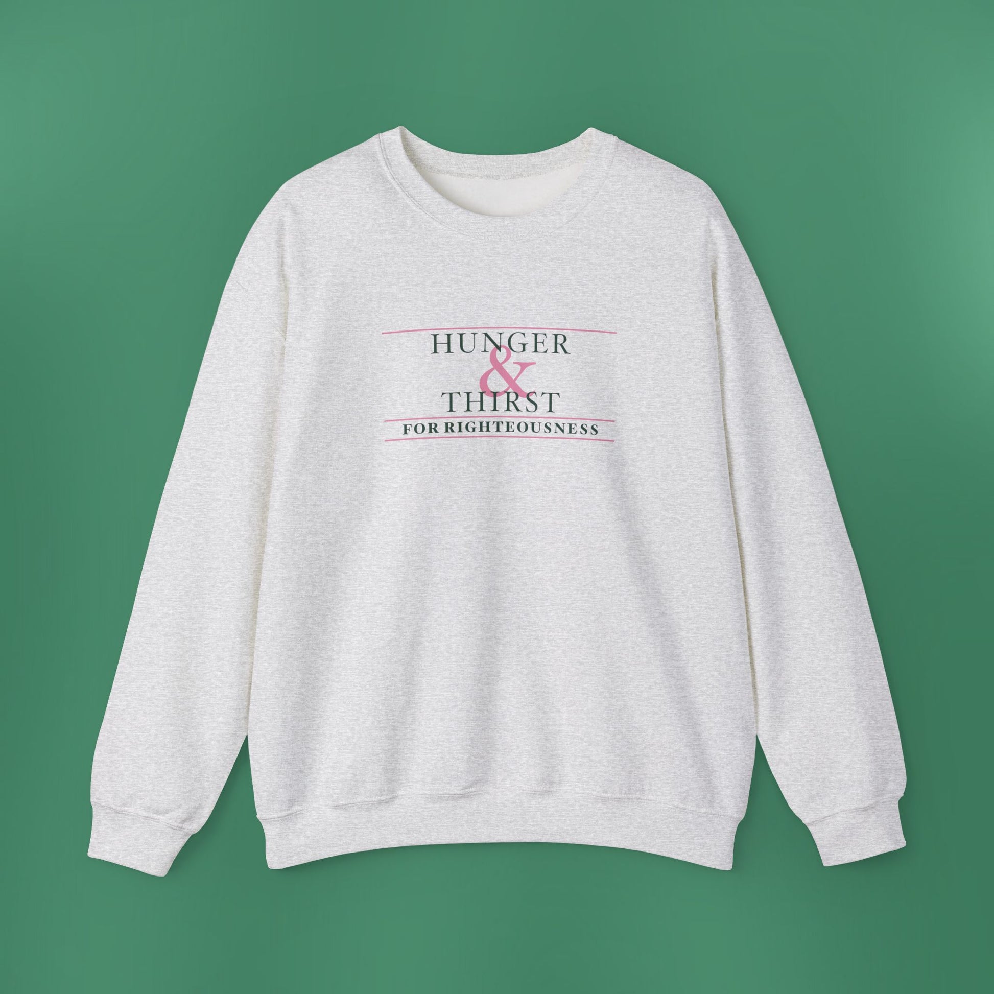 A simplistic, yet stunning design, this heavy blend crewneck sweatshirt is pure comfort that refers directly to Matthew 5:6! The collar is ribbed knit, so it retains its shape even after washing. There are no itchy side seams on these sweaters. The sweatshirt has a loose fit with medium-heavy fabric.