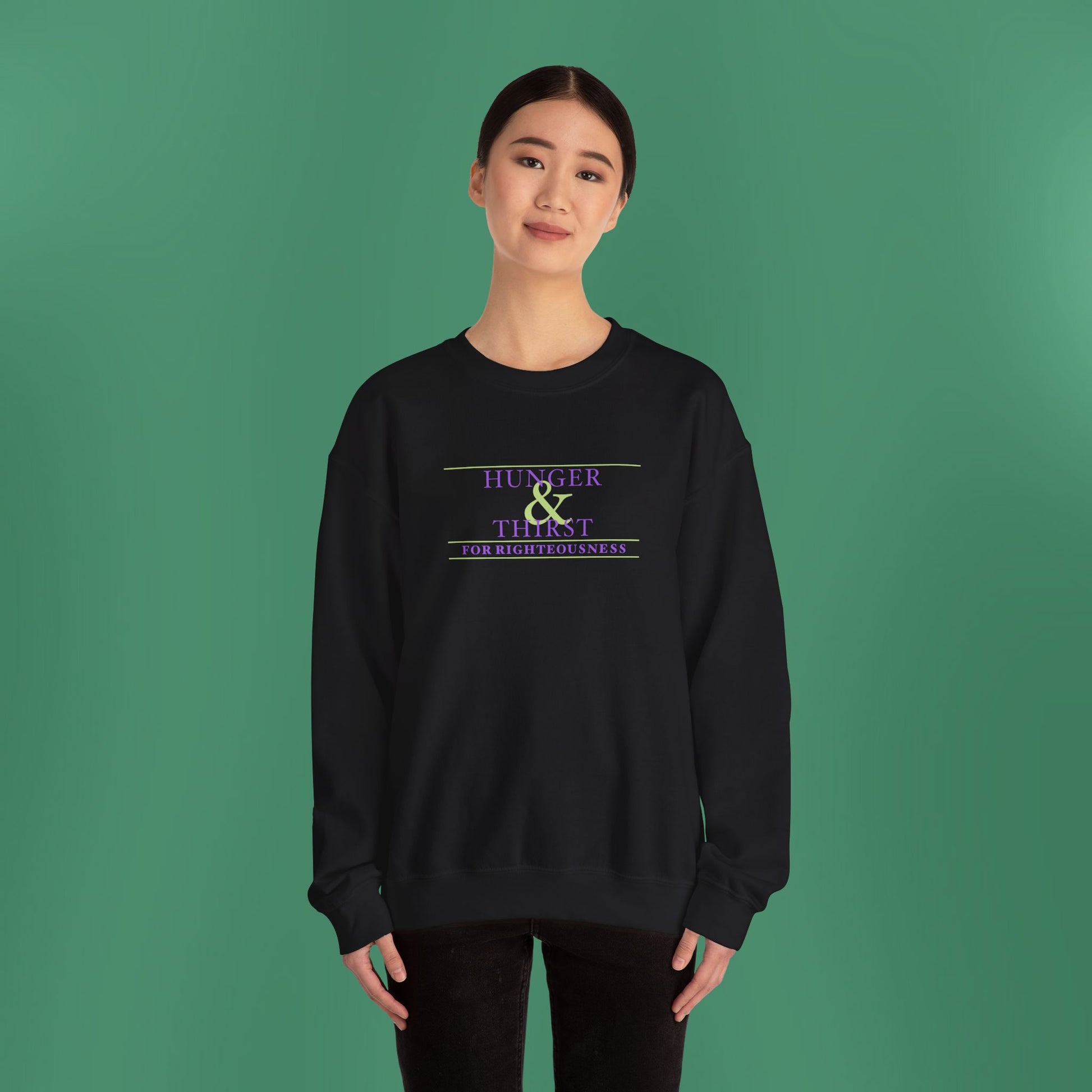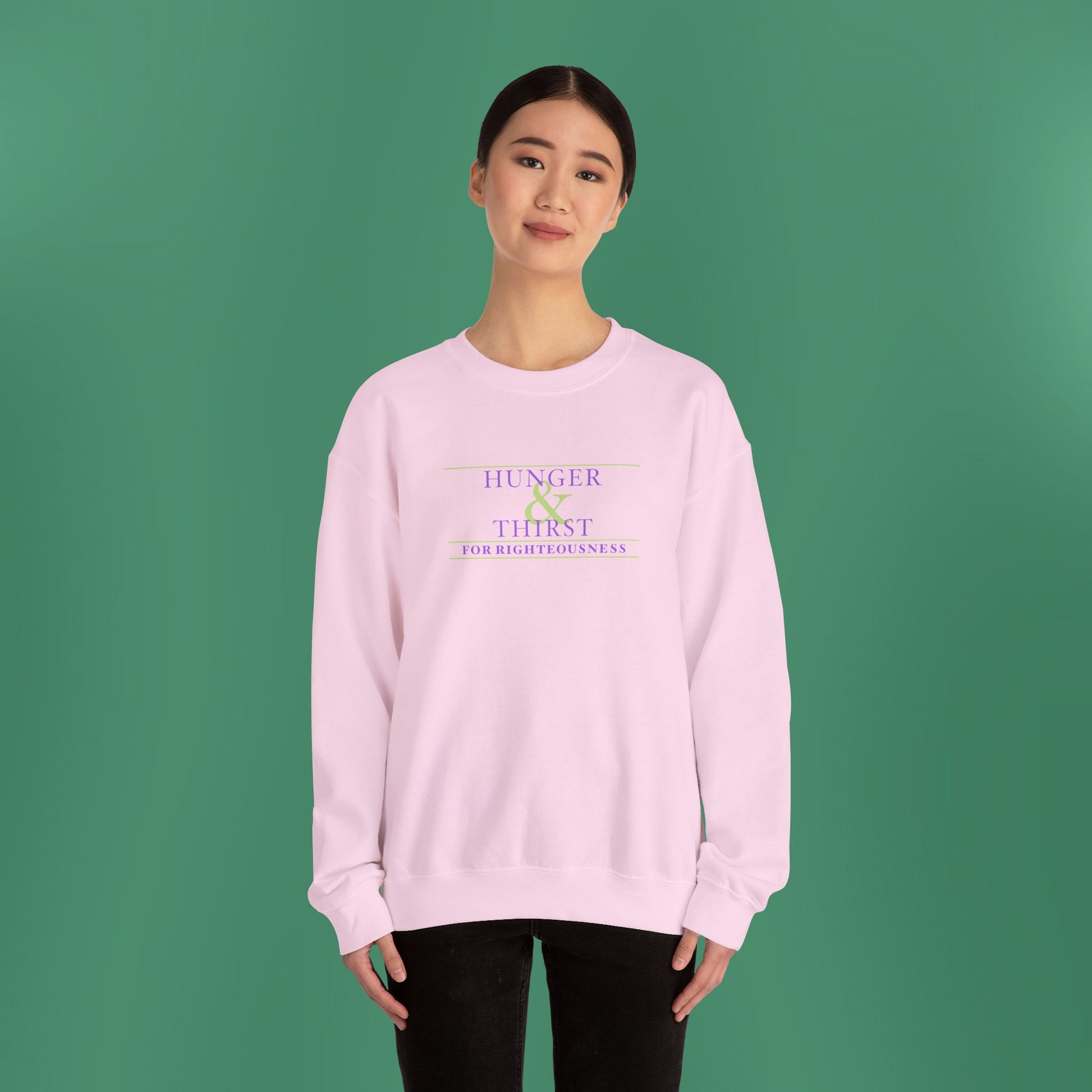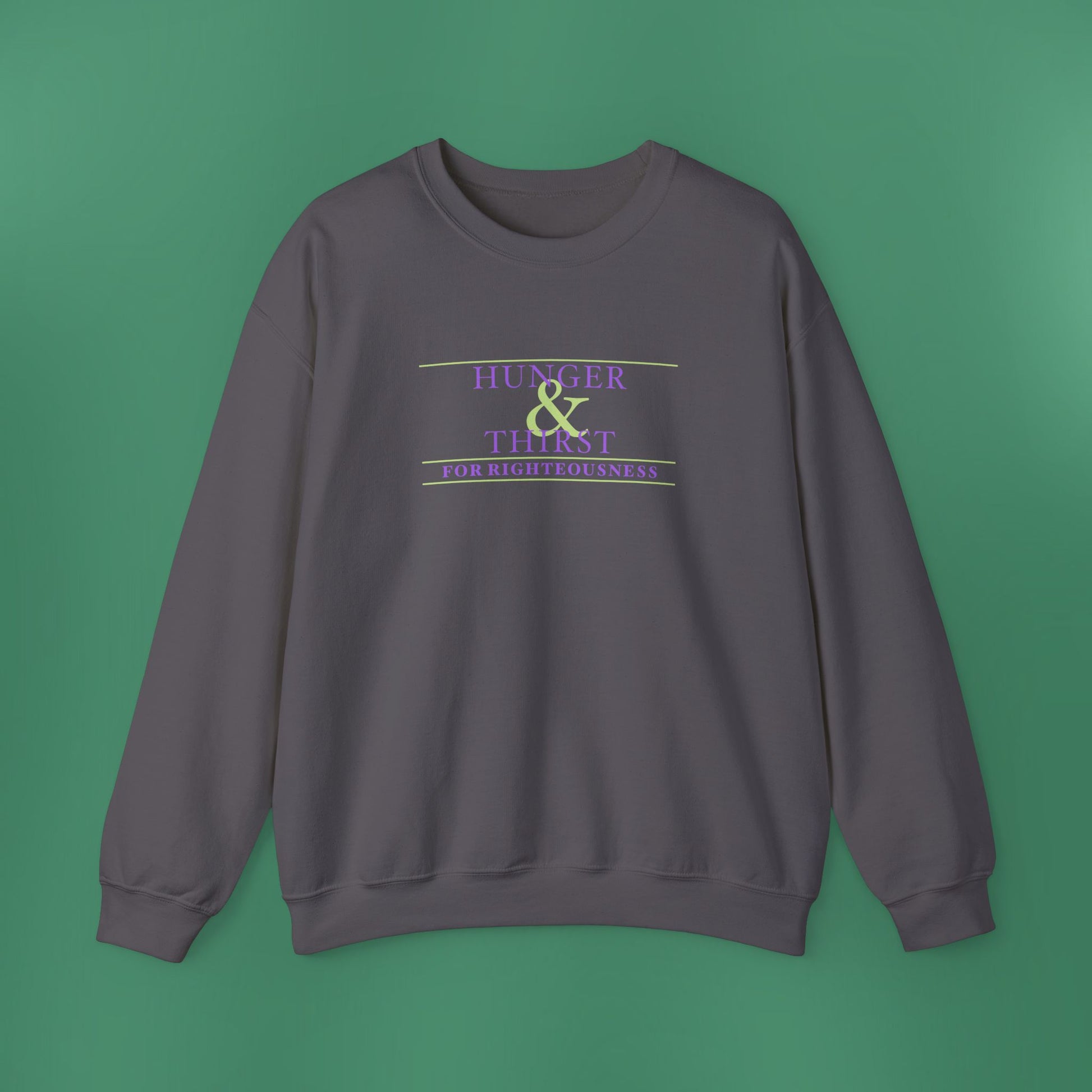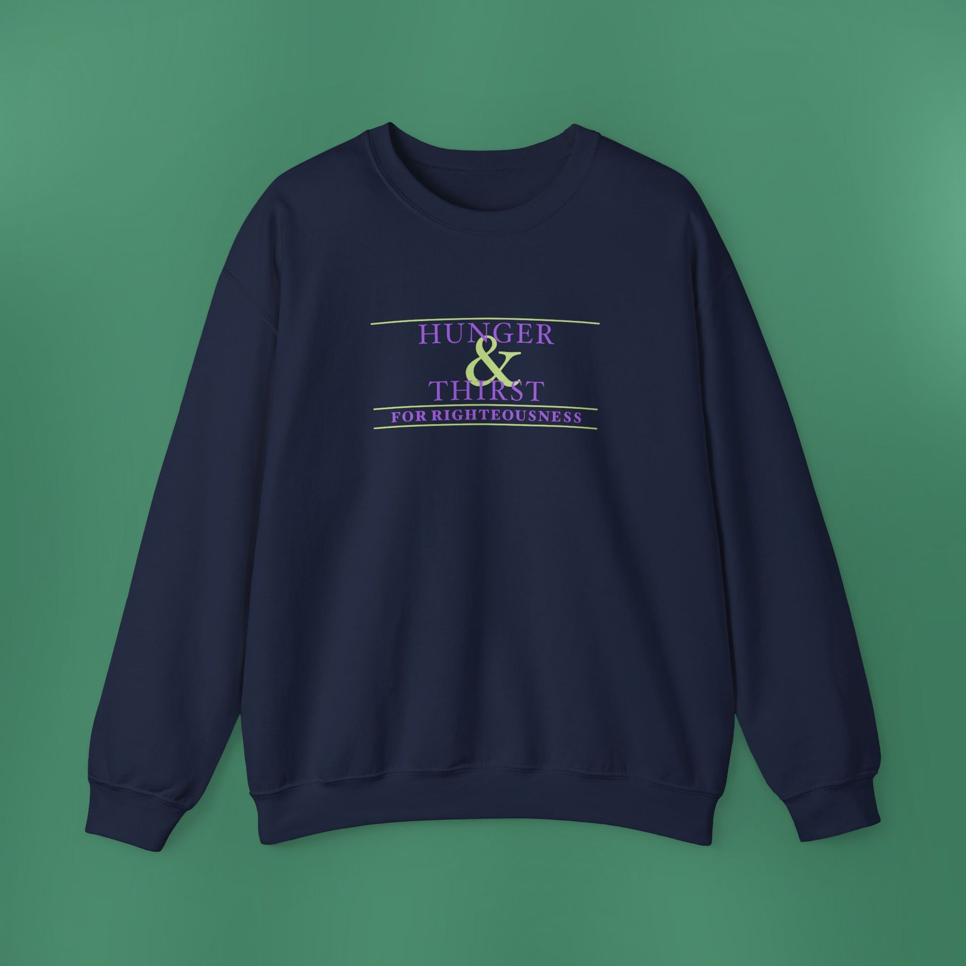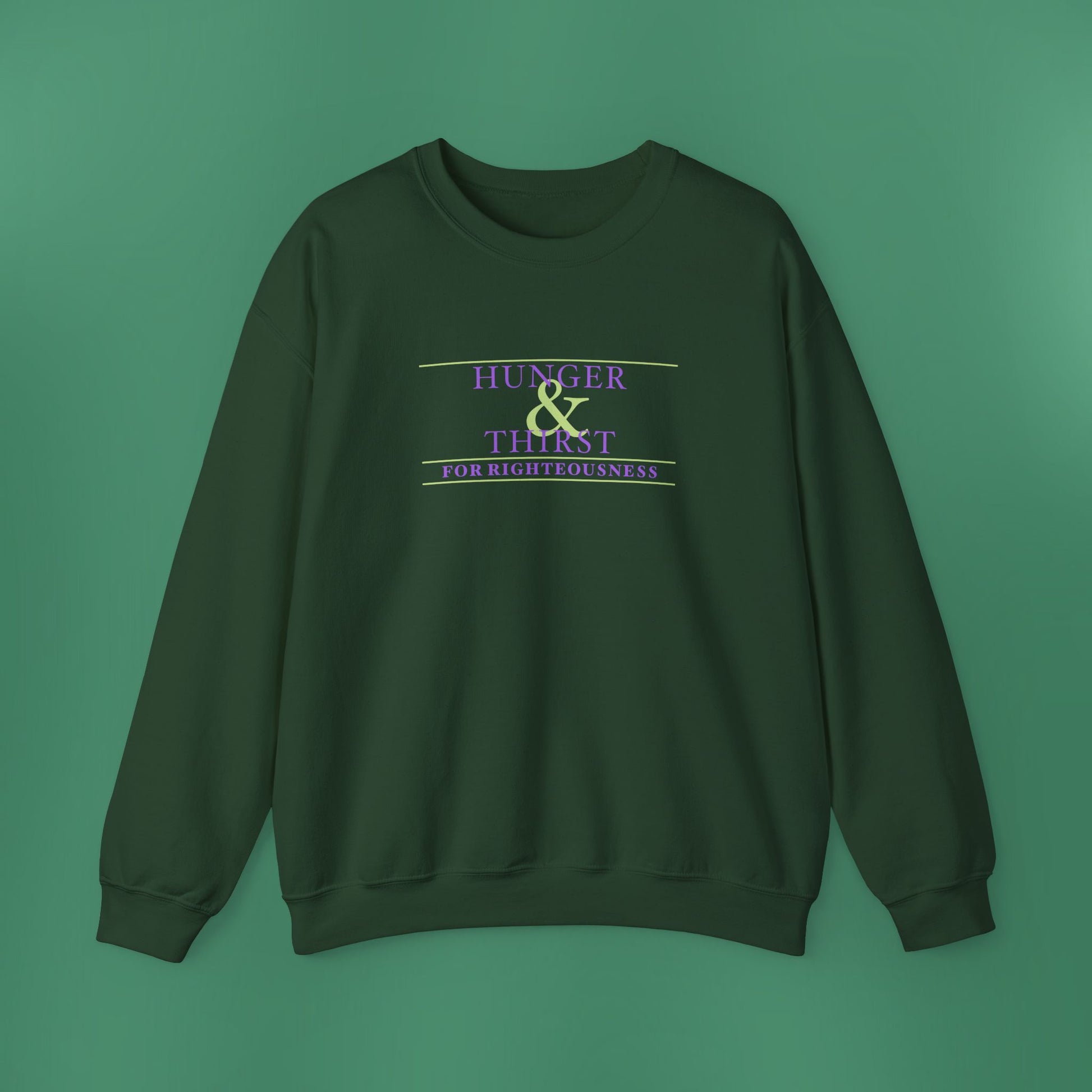 A simplistic, yet stunning design, this heavy blend crewneck sweatshirt is pure comfort that refers directly to Matthew 5:6! The collar is ribbed knit, so it retains its shape even after washing. There are no itchy side seams on these sweaters. The sweatshirt has a loose fit with medium-heavy fabric.