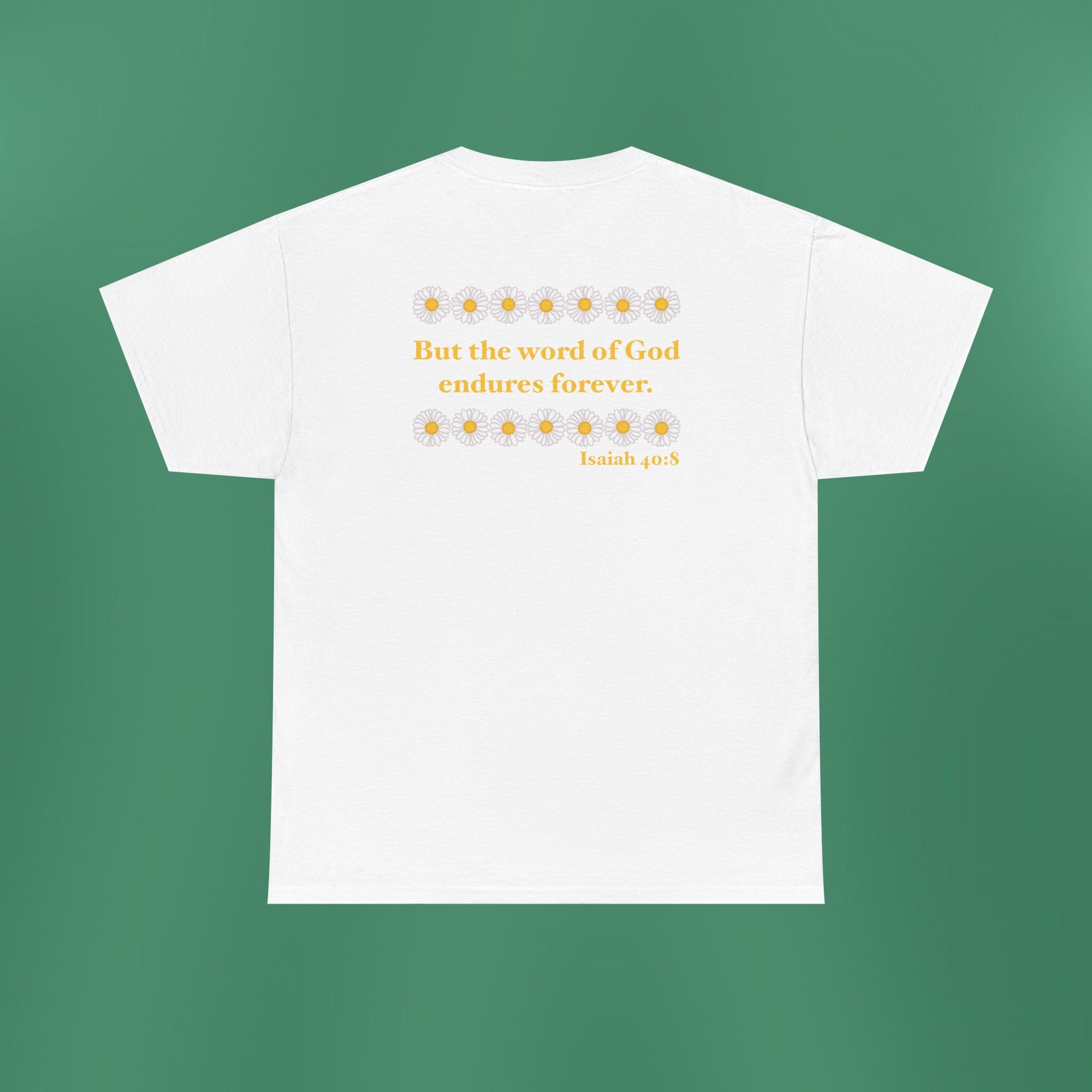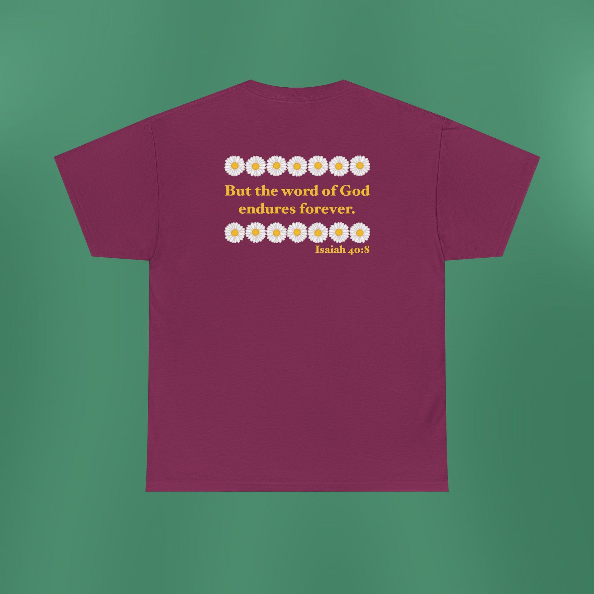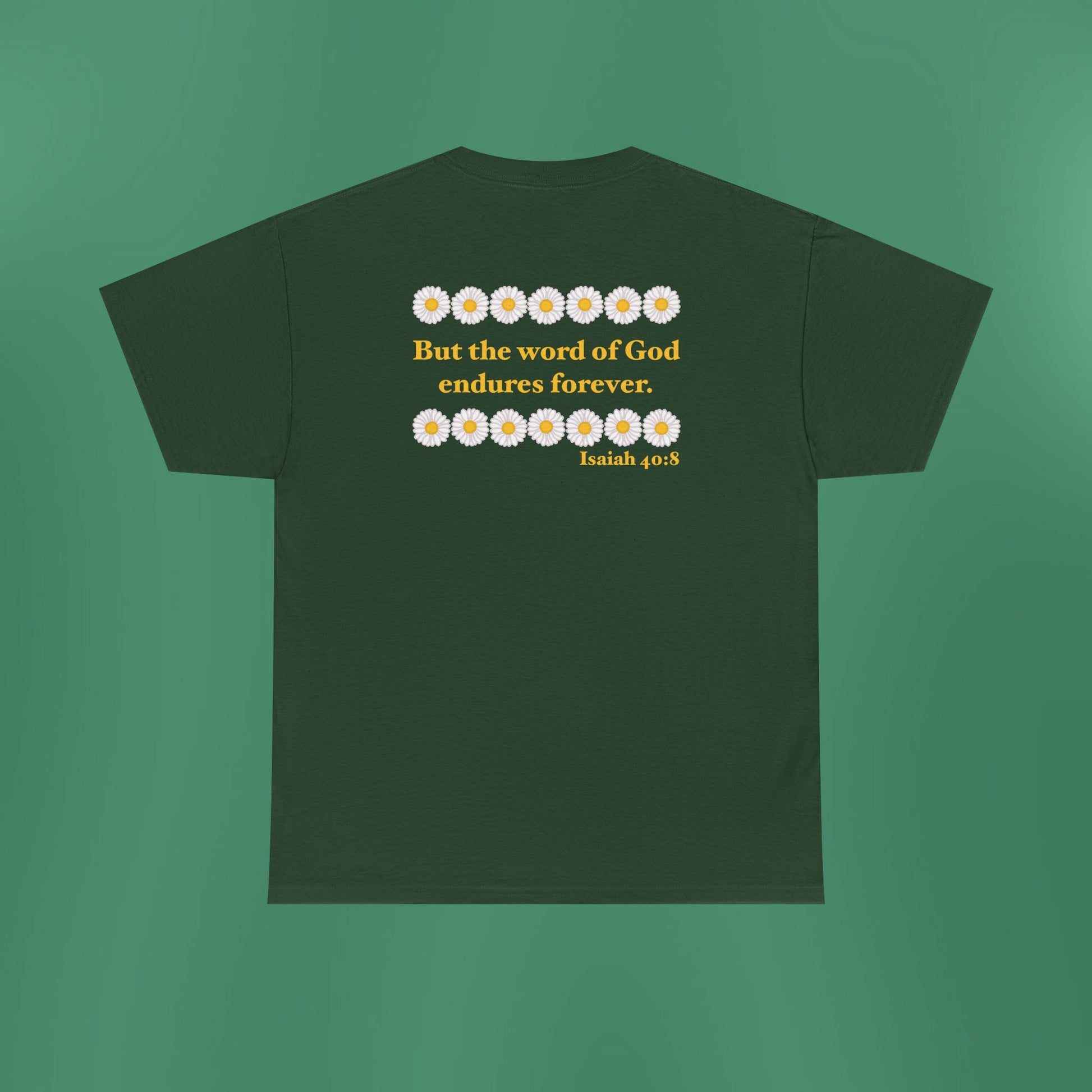 A simplistic, yet stunning design based on Isaiah 40:8! The heavy cotton tee is the basic staple of any wardrobe. The shirt has a classic, comfy fit with medium fabric.