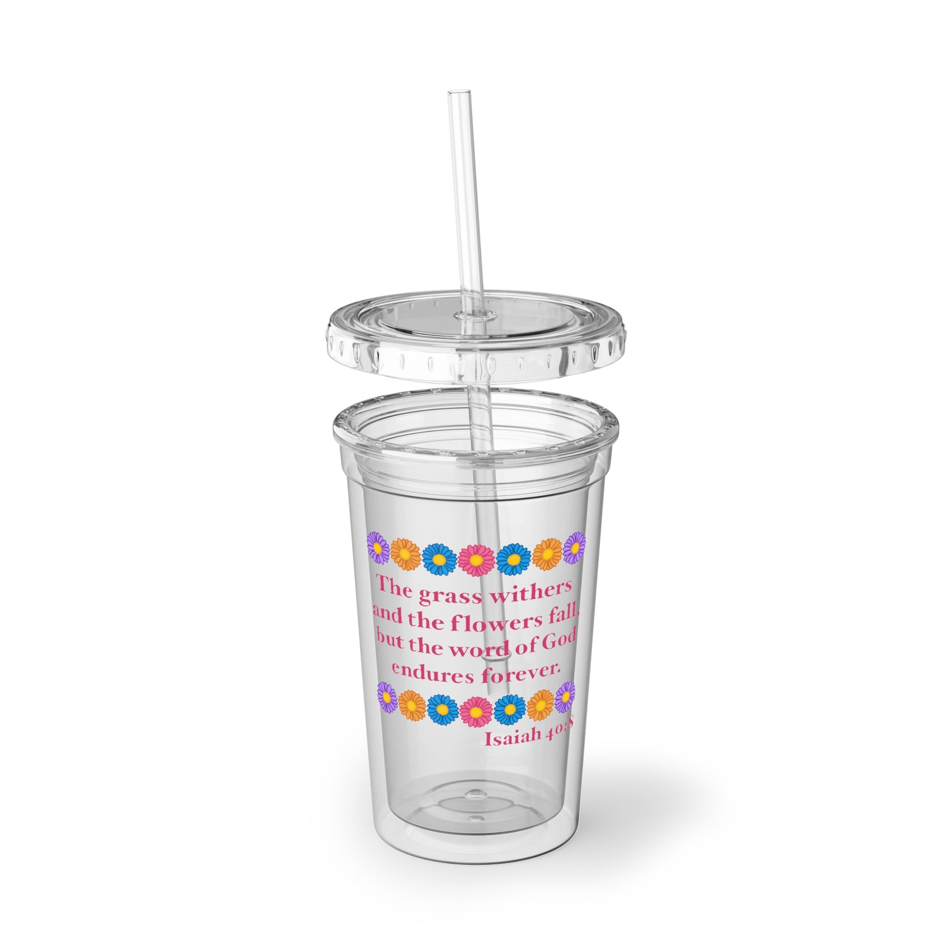 Decorated with Isaiah 40:8 and made for grabbing beverages on the go, this double-wall insulated acrylic cup will keep cold drinks cold for 24 hours and hot for 12 hours. The cup, the plastic lid, and the straw are all BPA-free. This tumbler is made with a digital inkjet printing technique that transfers designs line by line. This means that faint horizontal lines might be visible on the final product.