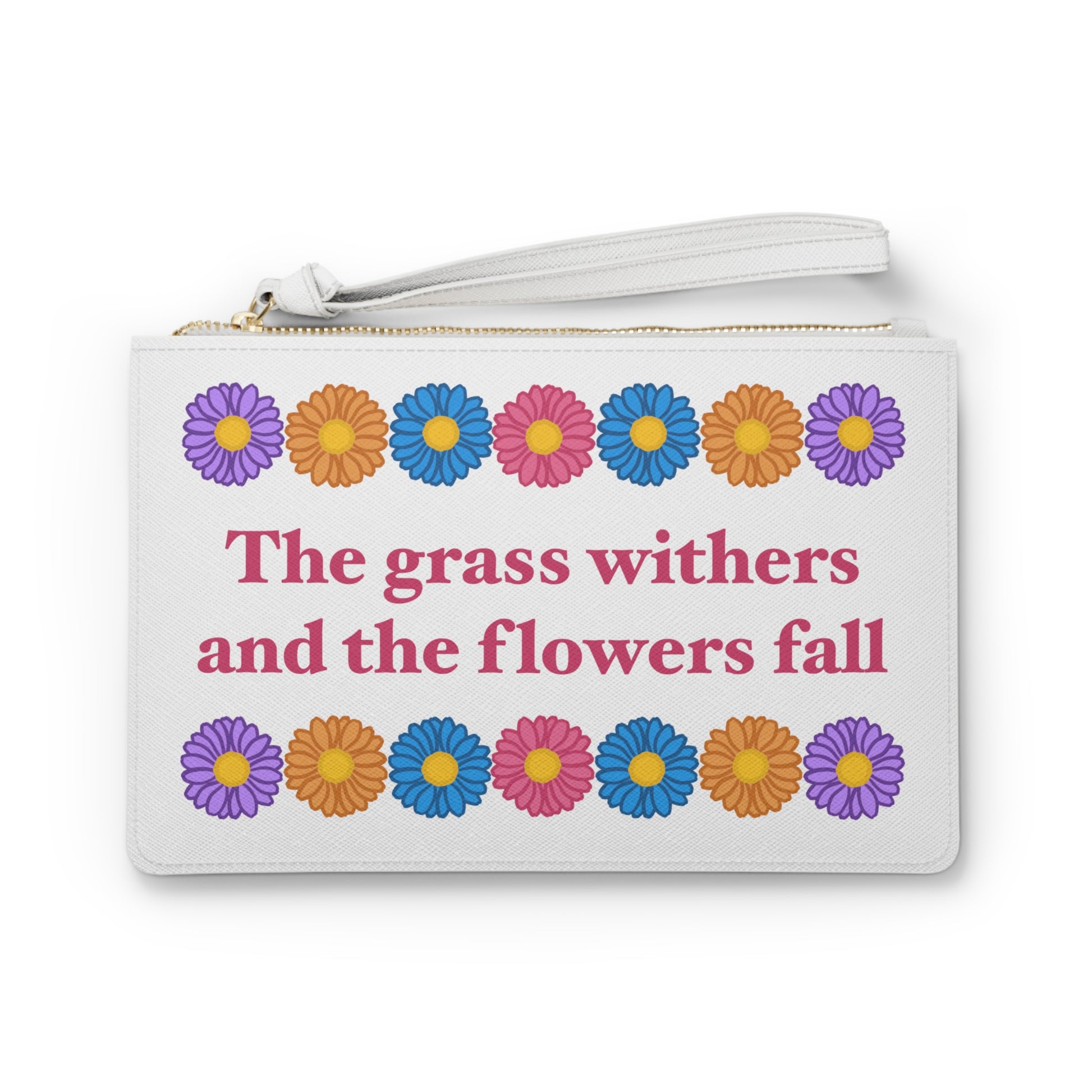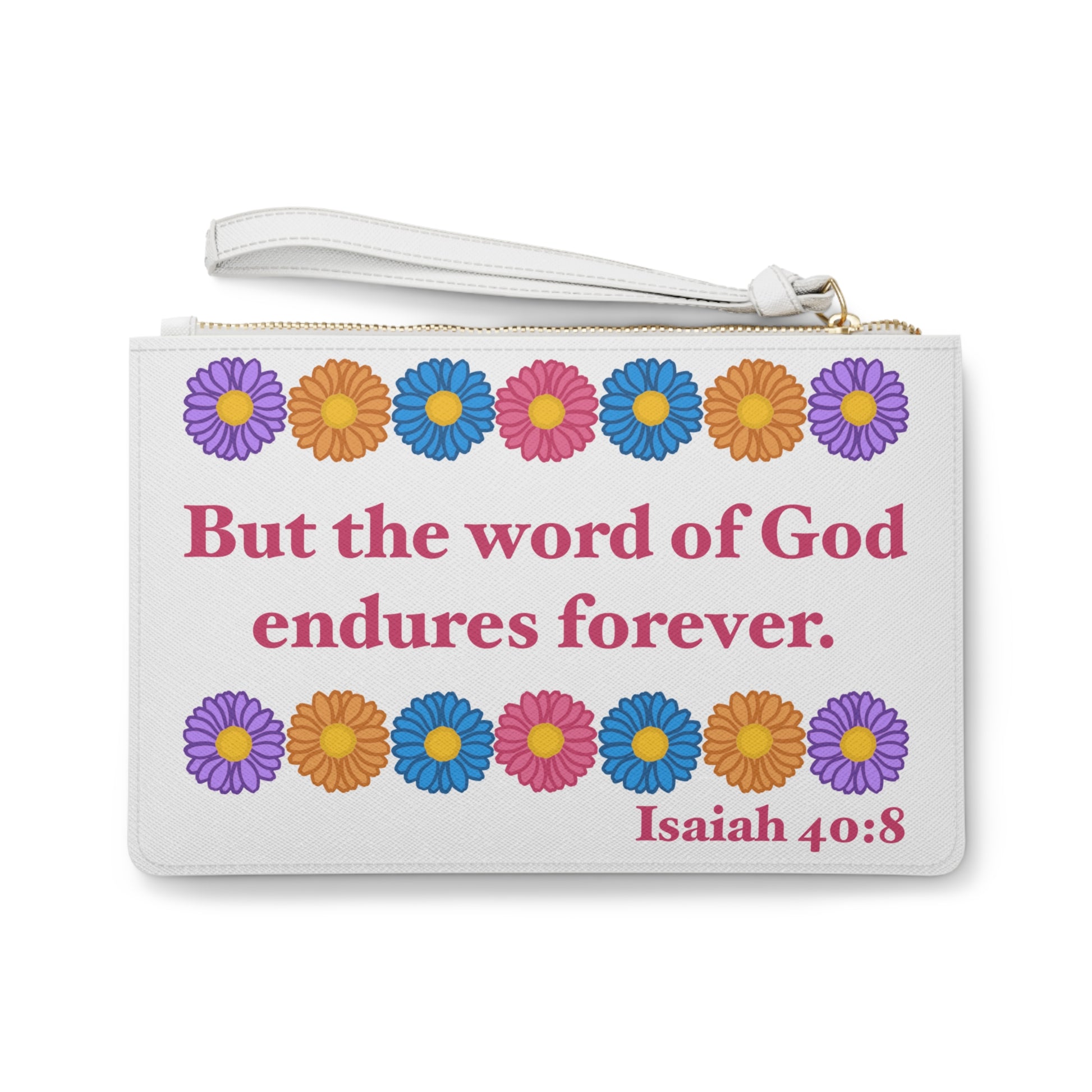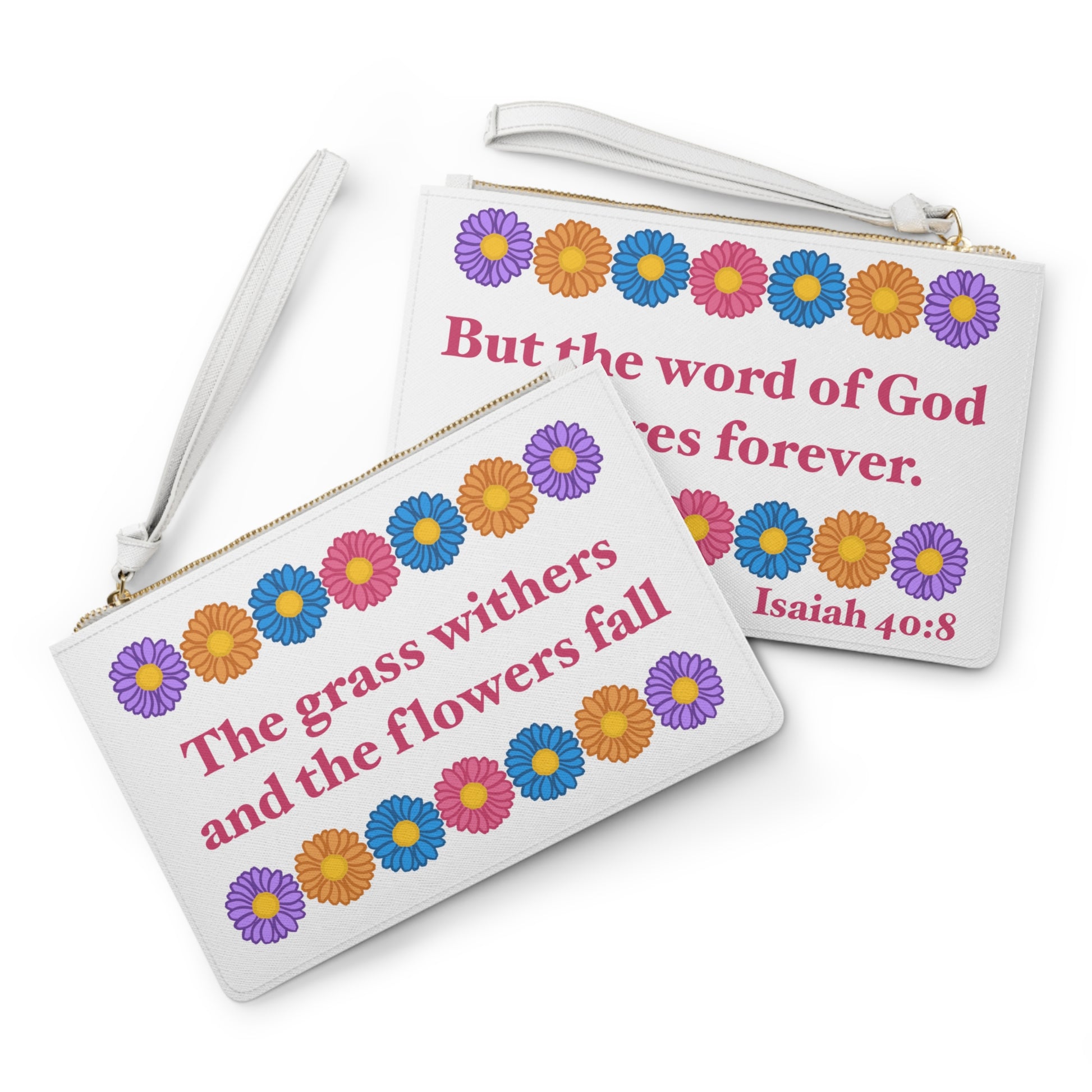 Designed using Isaiah 40:8, this custom clutch bag can hold everyday essentials. It features a zip fastening and a fully lined internal pocket. It is made of vegan leather in the Saffiano pattern finish that was invented by Prada. This product comes in one size: 9.5" x 6.6" (24 x 17 cm).