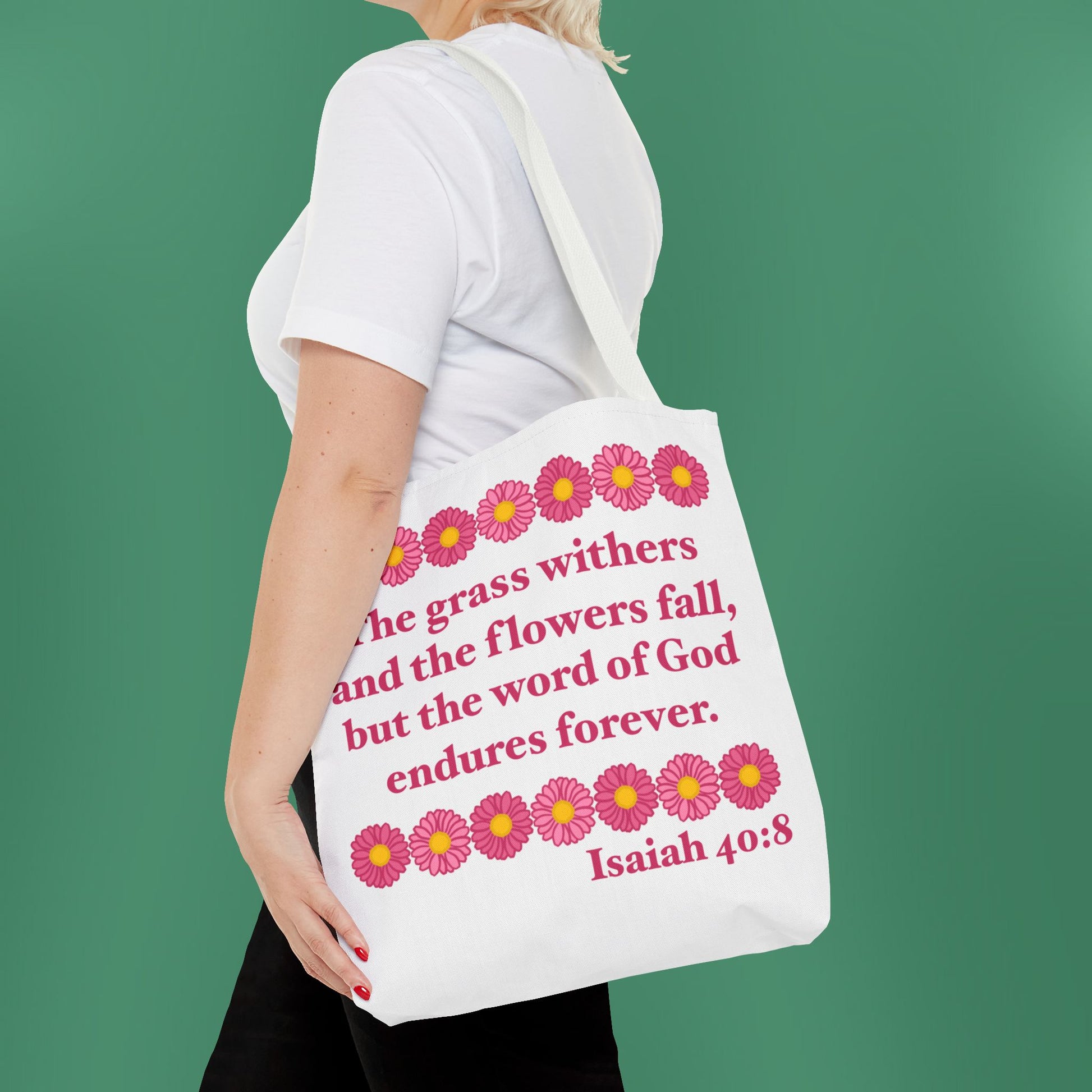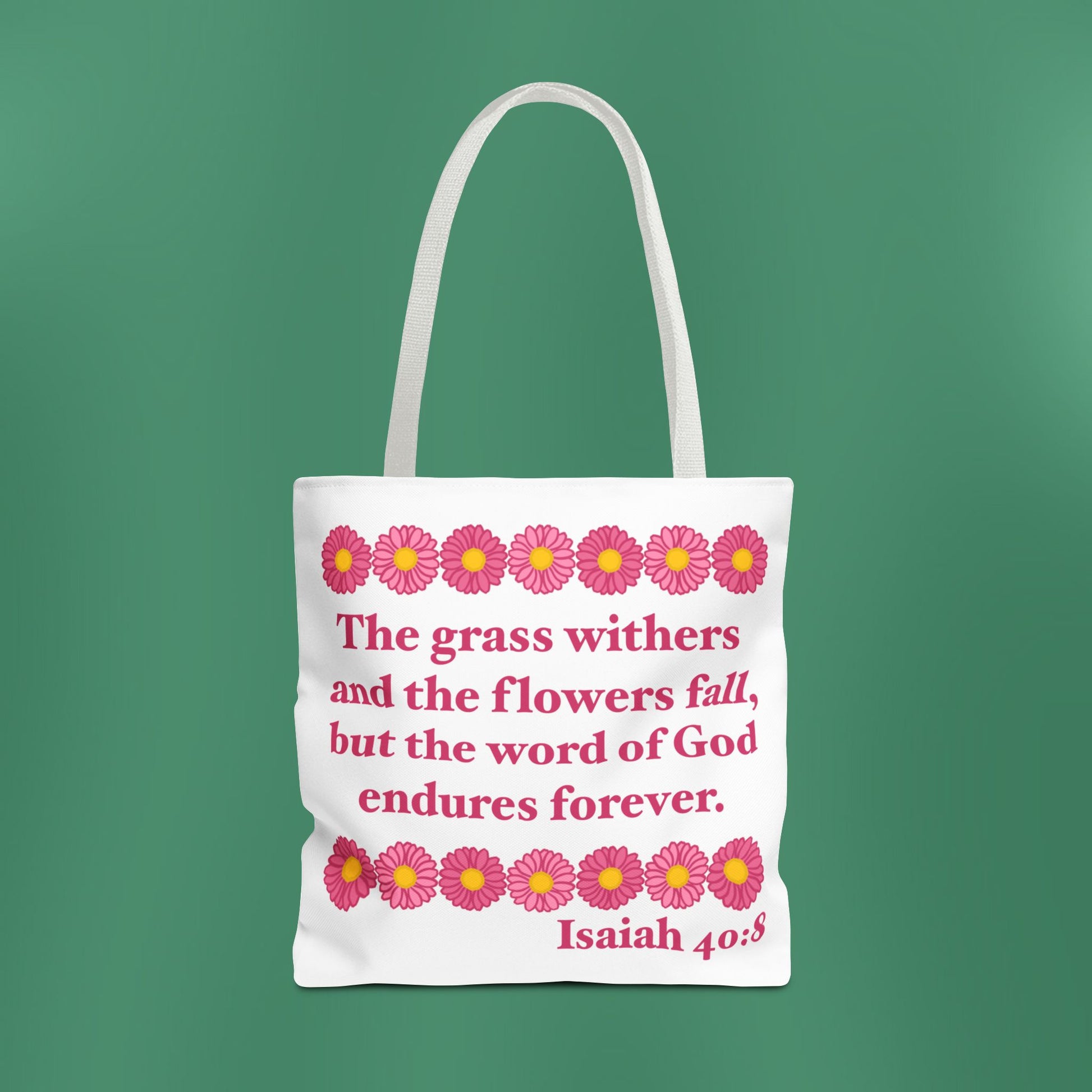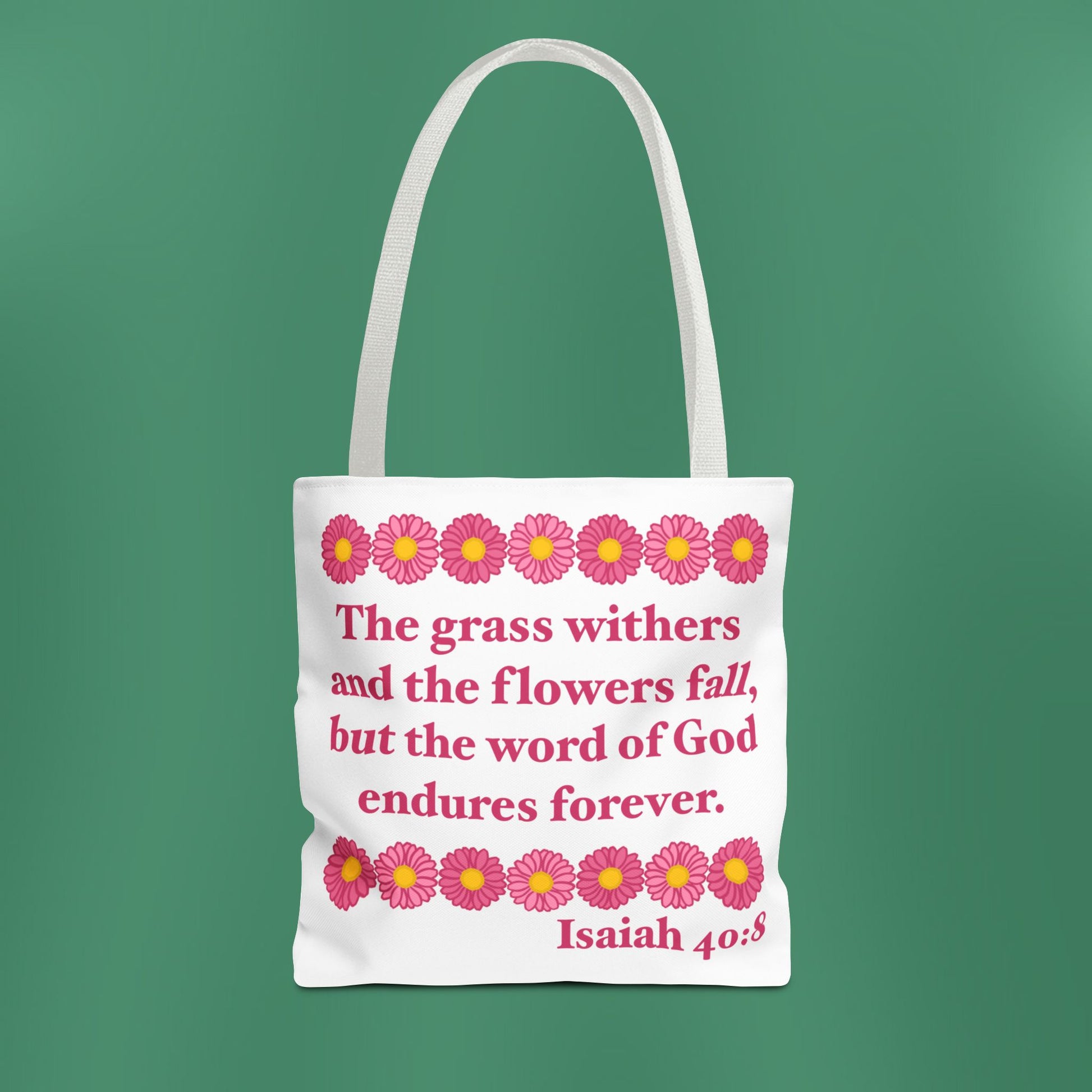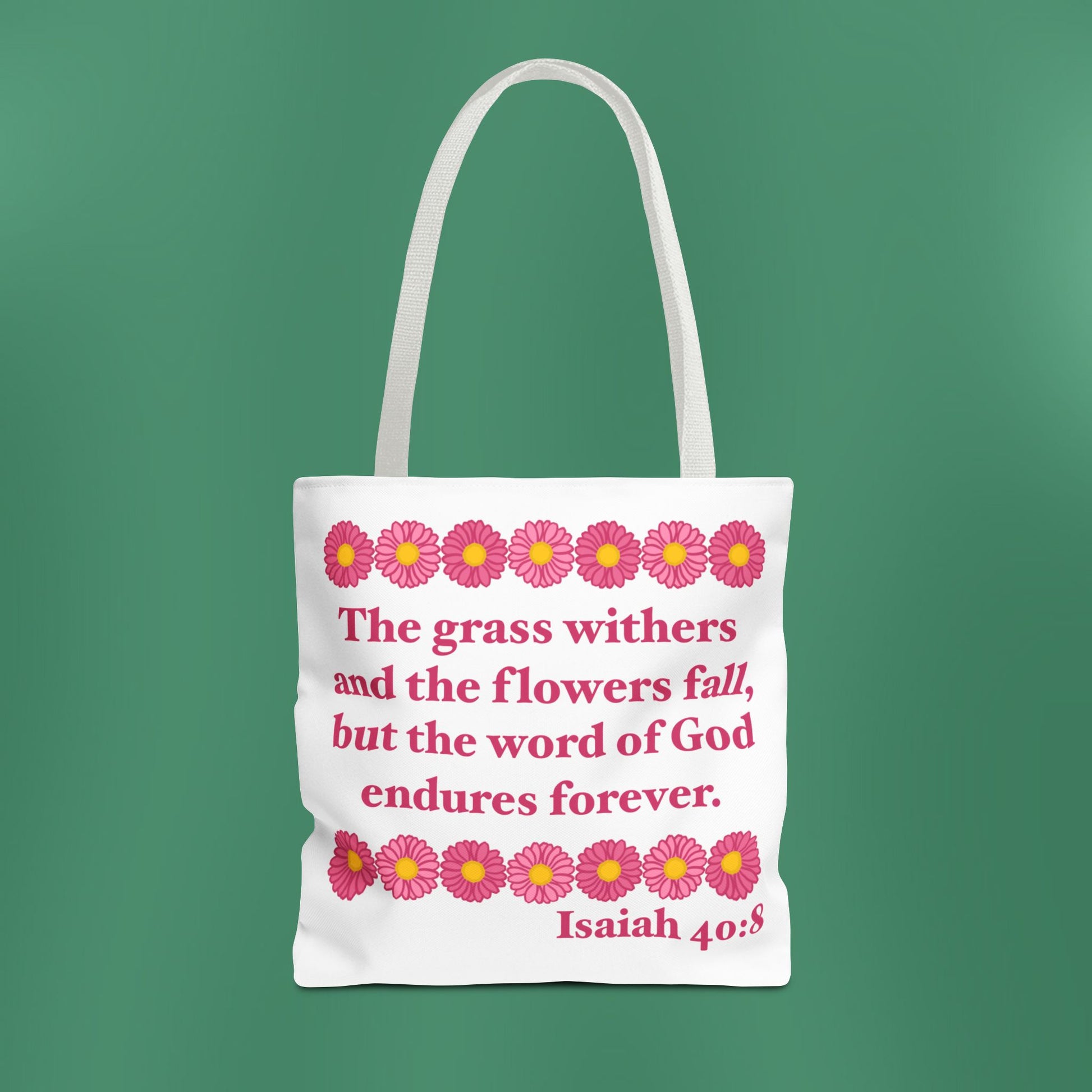 Available in 3 sizes to add both functionality and style, these tote bags beautifully depict the message of Isaiah 40:8! Made with spun polyester, these bags feature double-stitched seams, cotton webbing straps, and nonwoven laminate lining for high-end durability.