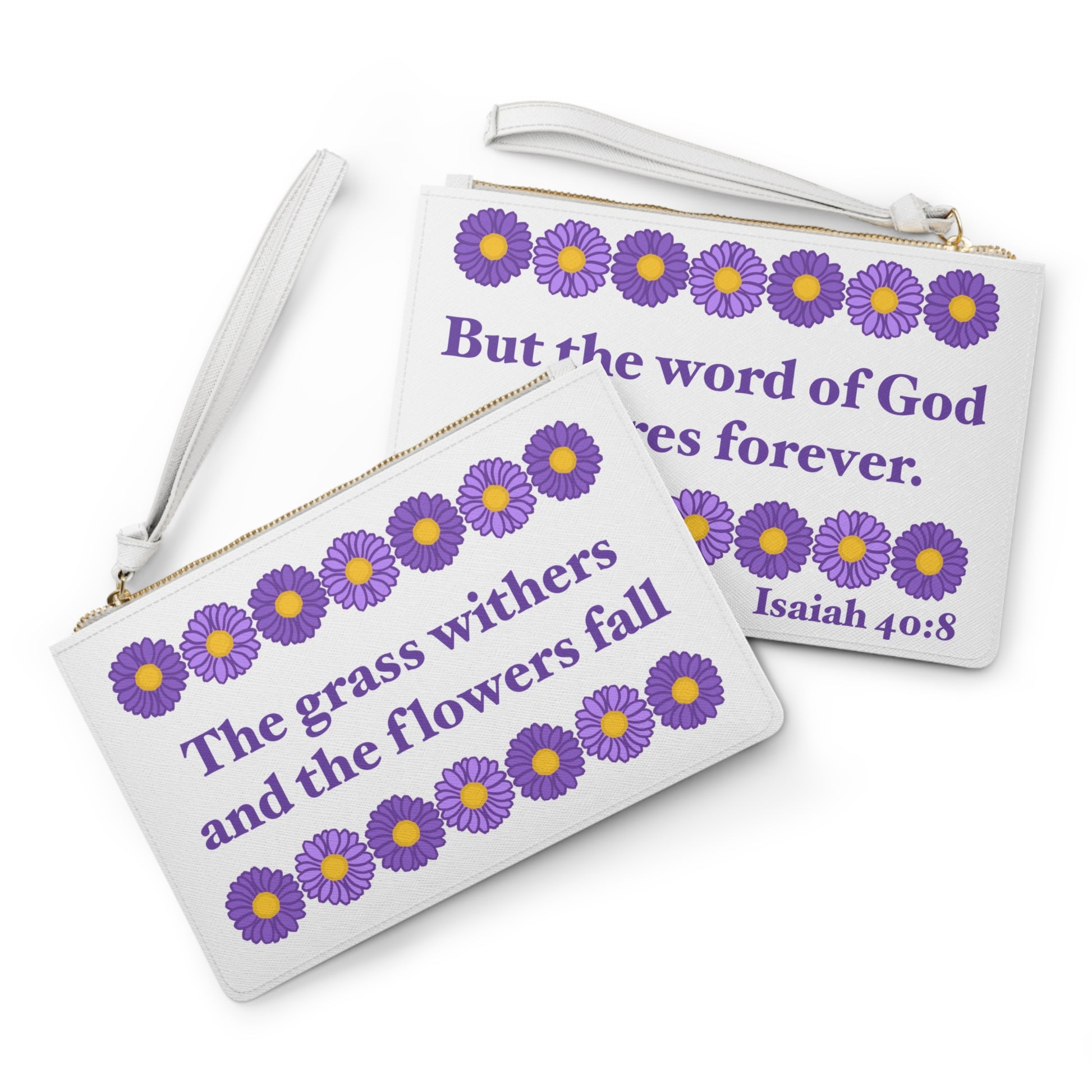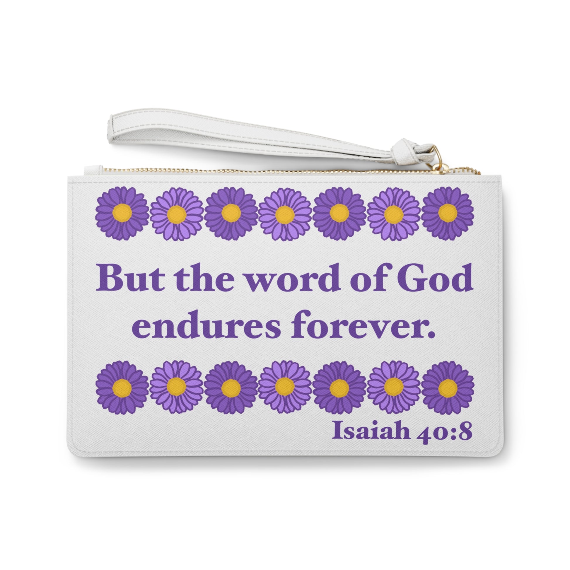 Designed using Isaiah 40:8, this custom clutch bag can hold everyday essentials. It features a zip fastening and a fully lined internal pocket. It is made of vegan leather in the Saffiano pattern finish that was invented by Prada. This product comes in one size: 9.5" x 6.6" (24 x 17 cm).