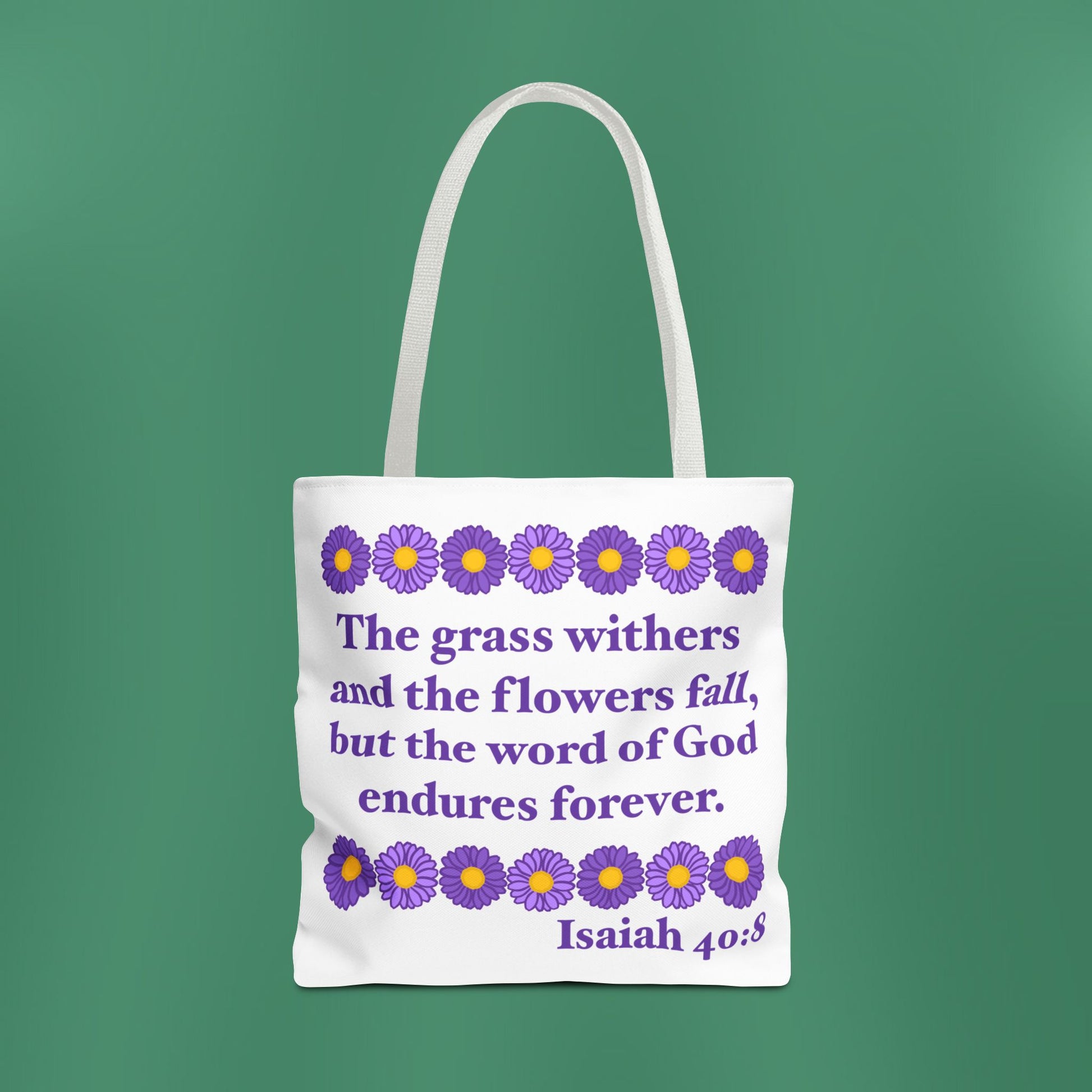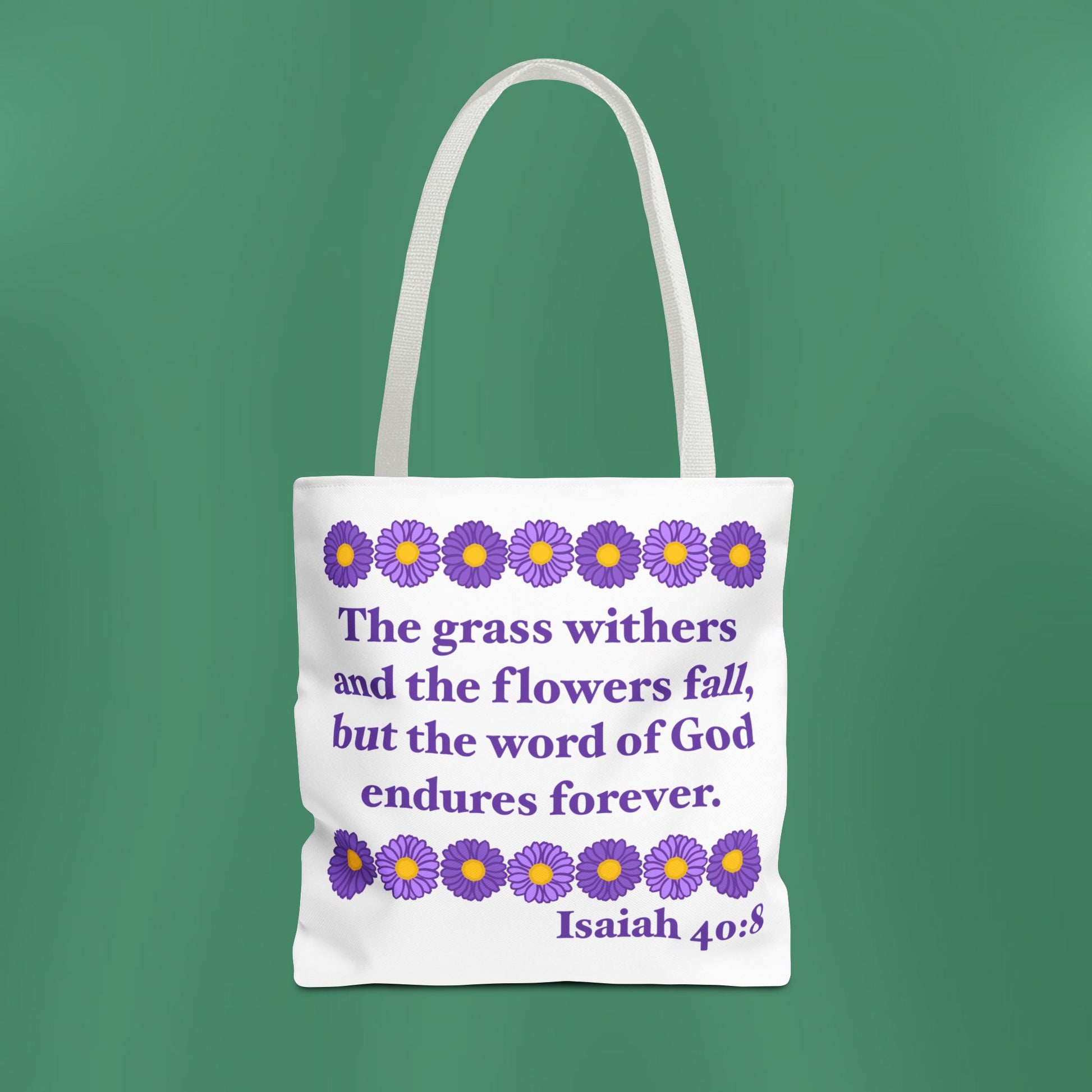 Available in 3 sizes to add both functionality and style, these tote bags beautifully depict the message of Isaiah 40:8! Made with spun polyester, these bags feature double-stitched seams, cotton webbing straps, and nonwoven laminate lining for high-end durability.