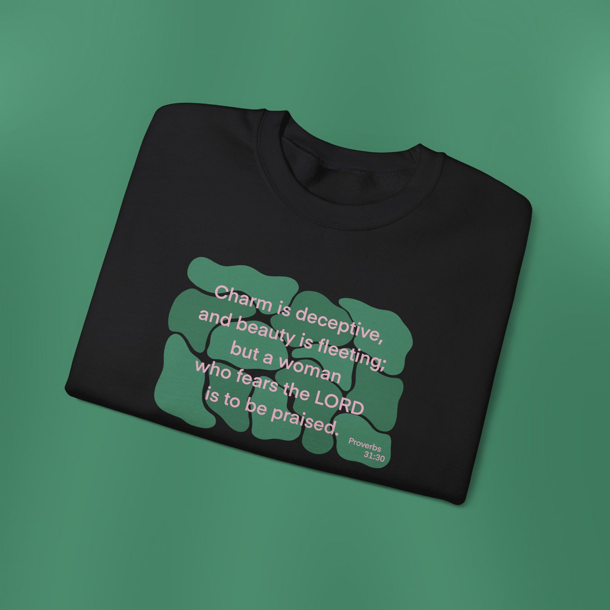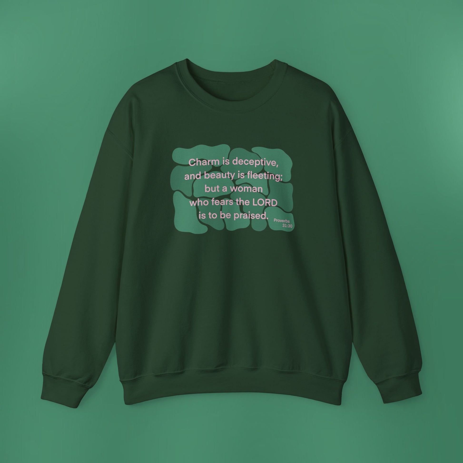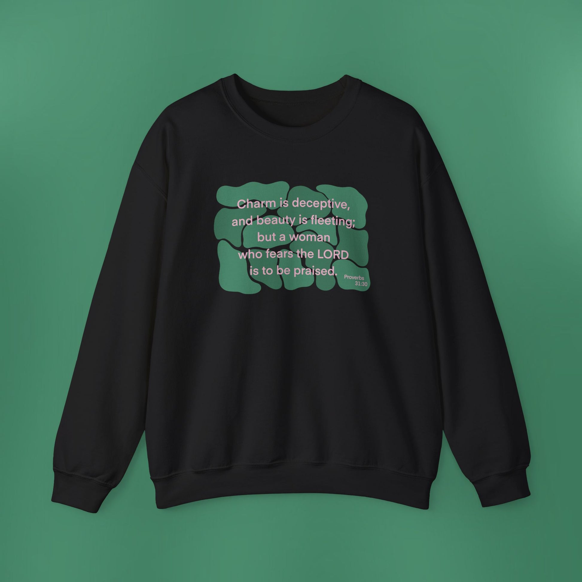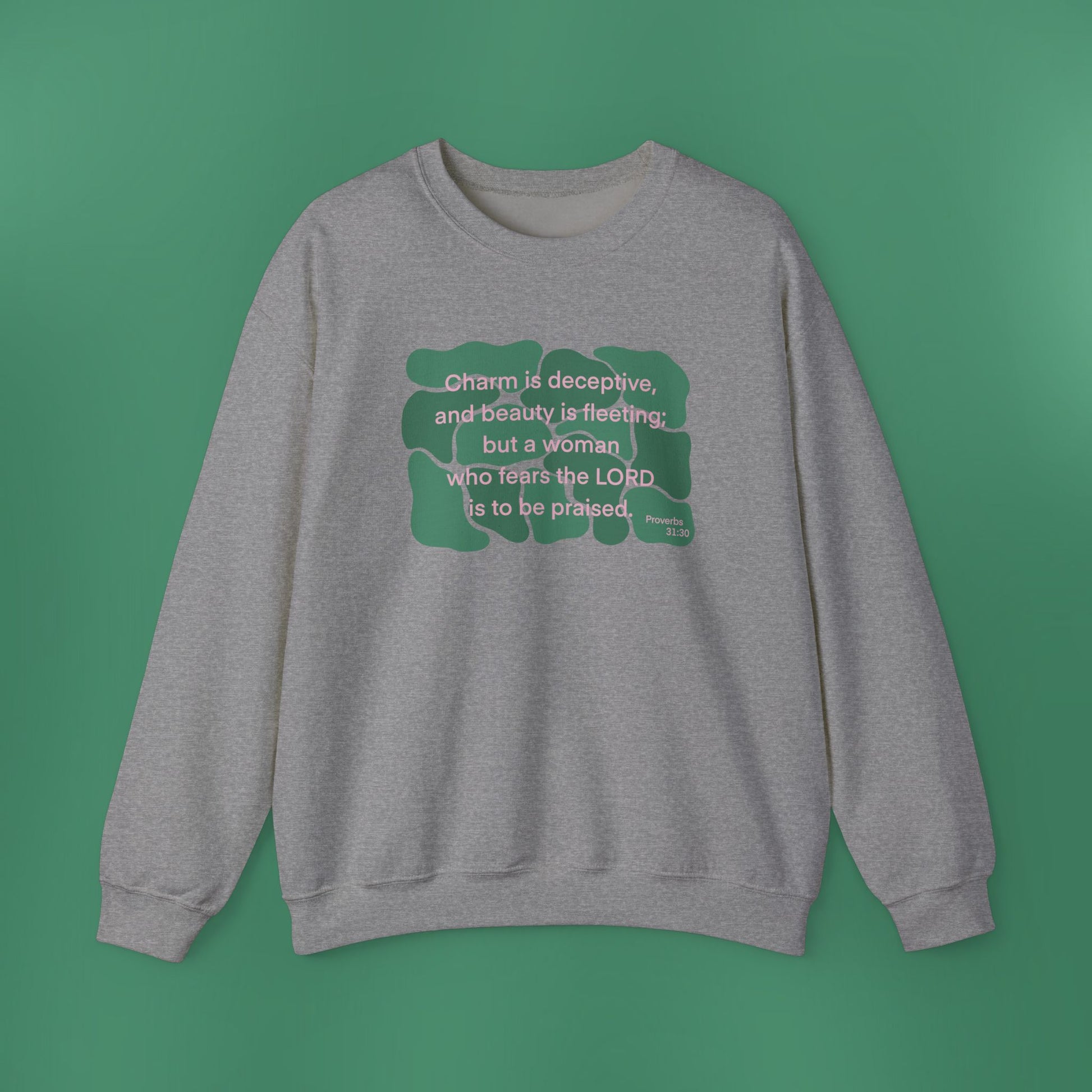 A simplistic, yet stunning design based on Proverbs 31:30! This heavy blend crewneck sweatshirt is pure comfort. The collar is ribbed knit, so it retains its shape even after washing. There are no itchy side seams on these sweaters. The sweatshirt has a loose fit with medium-heavy fabric.