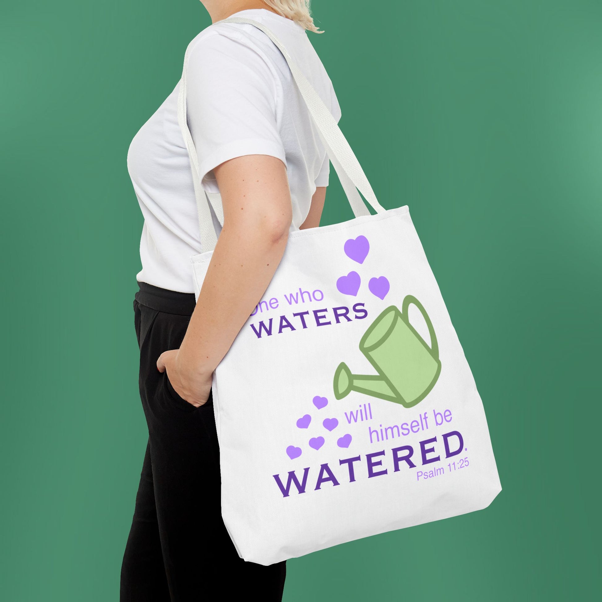 Available in 3 sizes to add both functionality and style, these tote bags beautifully depict the message of Psalm 11:25! Made with spun polyester, these bags feature double-stitched seams, cotton webbing straps, and nonwoven laminate lining for high-end durability.